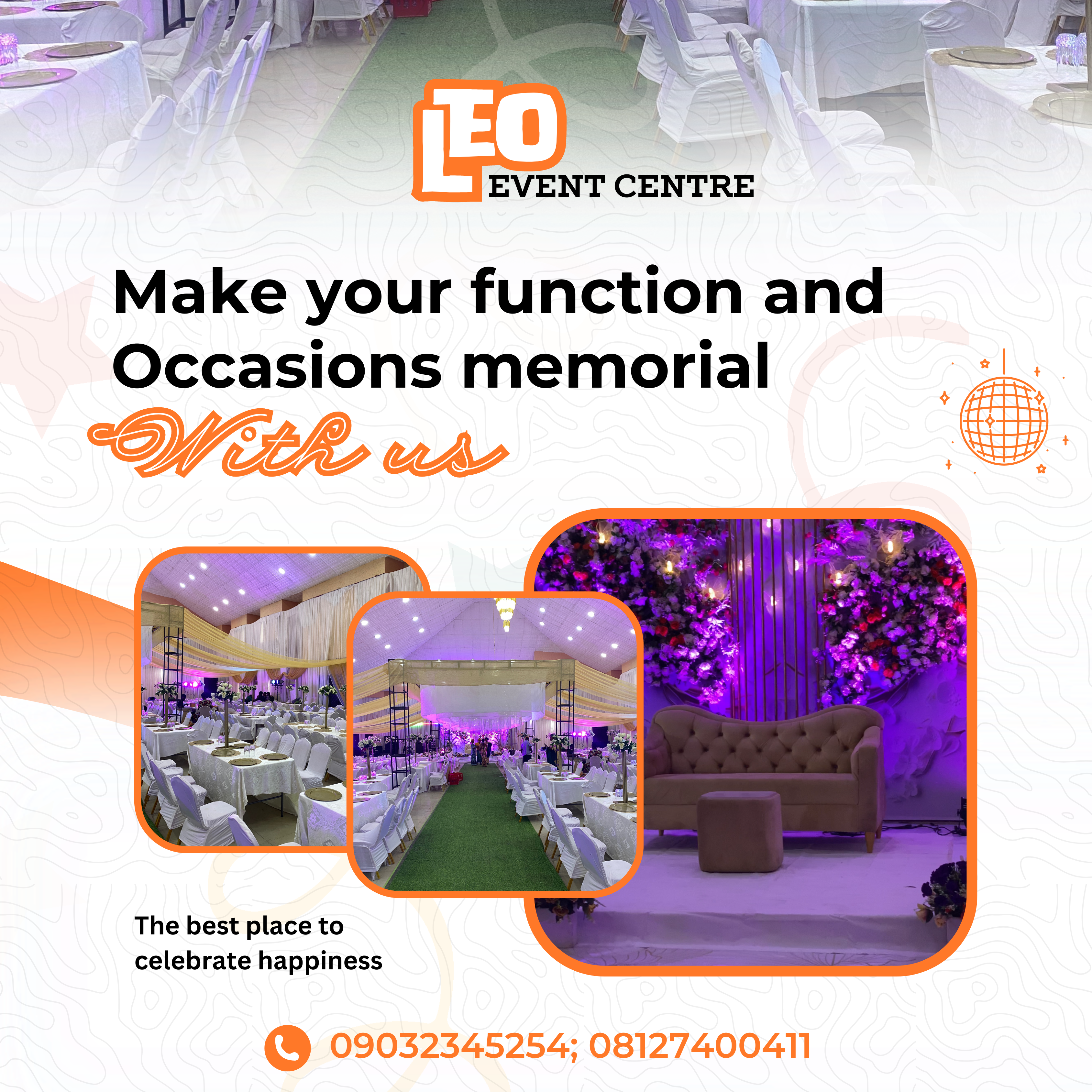 Leo Event Centre is a modern, classy, charming and irrestible multipurpose event halls for all kinds of events. We have 2 beautiful halls with different capacities. NIKKY HALL has a sitting capacity for 850 guest (banquet settings) and 1200 guests (Theatre setting) While ANJOLA HALL has a sitting capacity for 150 guests (banquet setting) and 250 guest (theatre setting)